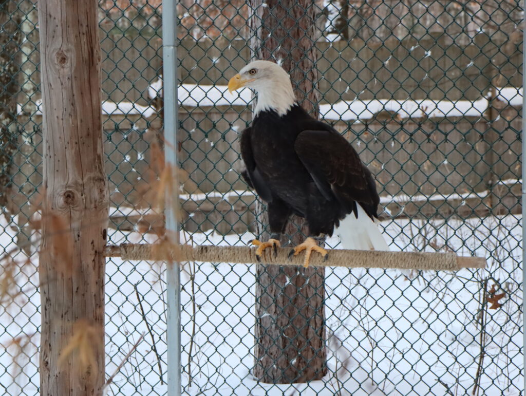 Hanna was transferred to the Northwoods Wildlife Center in winter 2018 from another wildlife rehabilitation facility located in Helena, Montana. After being hit by a train and undergoing a partial wing amputation, Hanna spent many years as an ambassador animal at that facility.